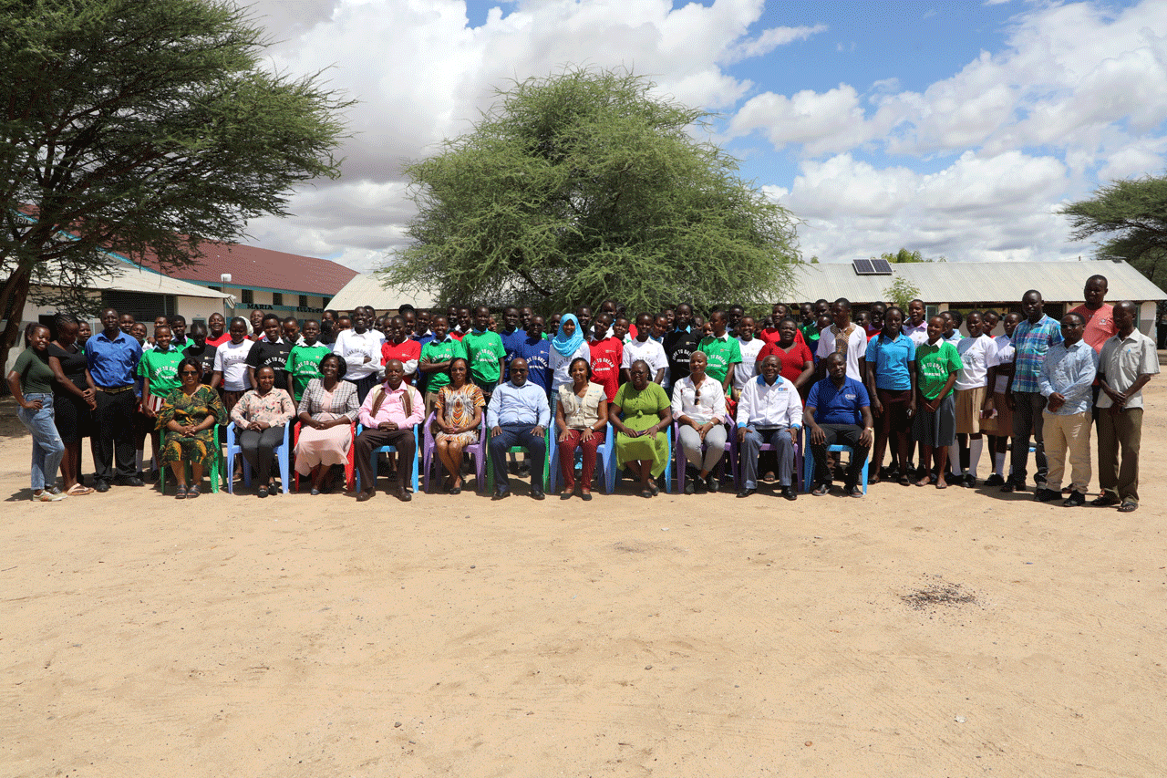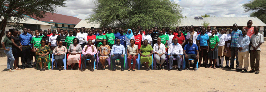 Girls from Turkana Secondary schools pose for a group photo with the the guest of honor – CEC Education Turkana County, CDE Turkana County, mentors, STEM Coordinators and their accompanying teachers during the STEM Mentorship Boot Camp in St. Monica Girls Boarding Comprehensive school in Lodwar, Turkana County.
